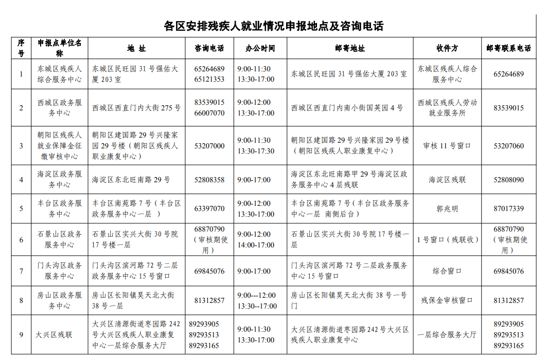 附件:各區(qū)安排殘疾人就業(yè)情況申報(bào)地點(diǎn)及咨詢電話表