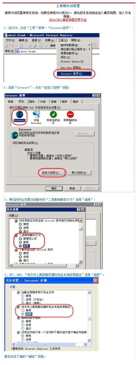 1、請(qǐng)先注意修改IE的安全設(shè)置:上傳照片IE設(shè)置