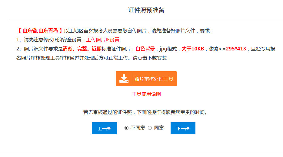 2、照片源文件要求是清晰、完整、近期標(biāo)準(zhǔn)證件照片,白色背景,jpg格式,大于10KB,像素>=295*413,且經(jīng)專用報名照片審核處理工具審核通過并處理后方可正常上傳。請點擊下方圖片下載安裝: