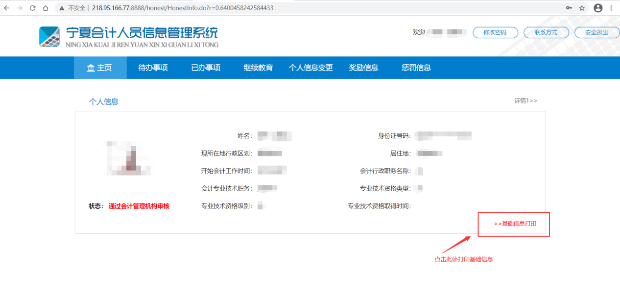 二、登錄成功,在主頁菜單中的個人信息右下角,點擊“基礎(chǔ)信息打印”即可打印個人的基礎(chǔ)信息,如圖: