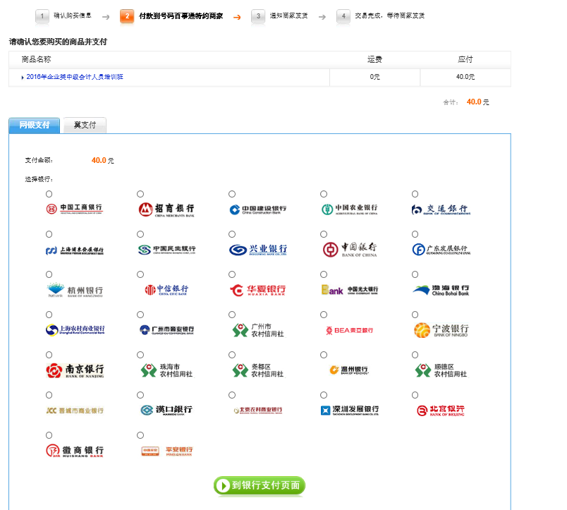 點擊“到銀行支付頁面”系統(tǒng)即可跳轉(zhuǎn)到所選銀行頁面。學(xué)員根據(jù)提示完成繳費(fèi)后系統(tǒng)會提示繳費(fèi)成功,培訓(xùn)班也同時開通。