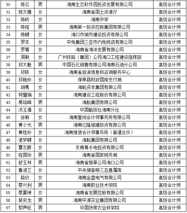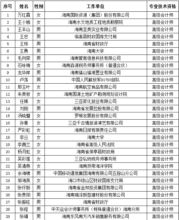經(jīng)2016年度海南省高級會計(jì)師專業(yè)技術(shù)資格評審委員會評審表決通過,并向社會公示無異議,現(xiàn)將海南省2016年度取得高級會計(jì)資格人員名單(按姓氏筆畫順序排列)公布如下: