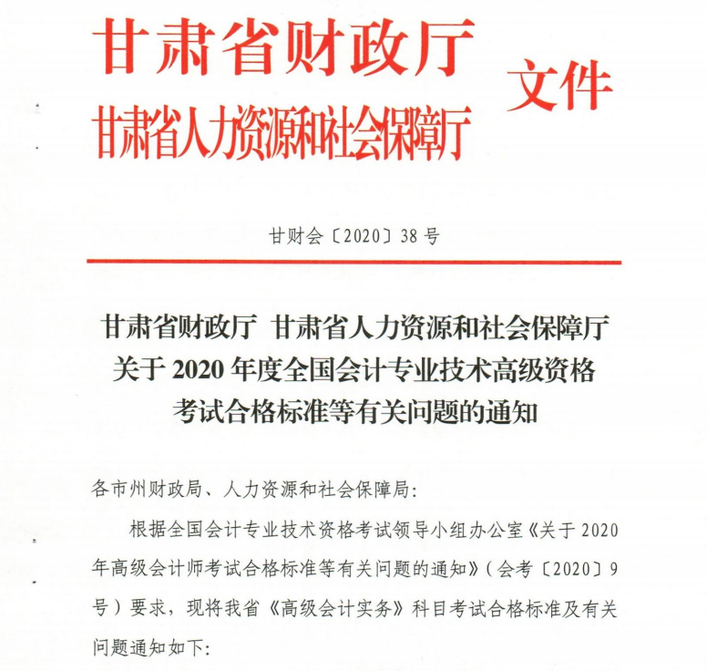 甘肅省發(fā)布《關(guān)于2020年度全國會(huì)計(jì)專業(yè)技術(shù)高級(jí)資格考試合格標(biāo)準(zhǔn)等有關(guān)問題的通知》的通知,甘肅2020年度高級(jí)會(huì)計(jì)師資格考試《高級(jí)會(huì)計(jì)實(shí)務(wù)》科目考試,甘肅省內(nèi)合格標(biāo)準(zhǔn)為55分。以下為通知全文: