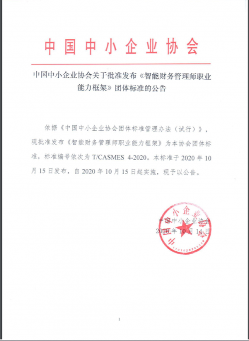 今年10月,中國(guó)中小企業(yè)協(xié)會(huì)在2020中國(guó)中小企業(yè)發(fā)展大會(huì)上正式公布《智能財(cái)務(wù)管理師職業(yè)能力框架》團(tuán)體標(biāo)準(zhǔn),并啟動(dòng)“智能財(cái)務(wù)管理師專業(yè)能力項(xiàng)目”。