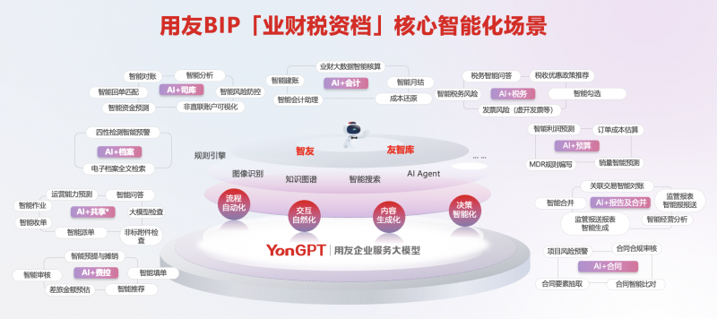 針對(duì)企業(yè)需求,基于自研的企業(yè)服務(wù)大模型YonGPT+通用大模型,融合自然語(yǔ)言處理(NLP)、多模態(tài)識(shí)別、預(yù)測(cè)分析模型等核心技術(shù),用友BIP提供了業(yè)財(cái)稅資檔一體化的數(shù)智服務(wù)場(chǎng)景,幫助企業(yè)實(shí)現(xiàn)從商旅費(fèi)控到共享、從核算到報(bào)告、從資金流動(dòng)性到投融資、稅務(wù)、檔案、合同等全鏈路的數(shù)智化升級(jí)。