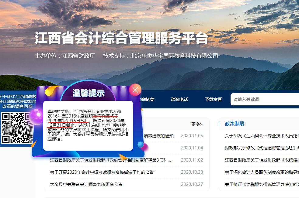 江西省會計專業(yè)技術(shù)人員2016年至2018年度繼續(xù)教育繳費(fèi)將于2020年12月15日截止,聽課時間2020年12月31日截止,逾期未完成上述年度繼續(xù)教育任務(wù)的學(xué)員將終止課程,所交納費(fèi)用不予退還,請廣大會計學(xué)員按規(guī)定盡快完成相應(yīng)課程。