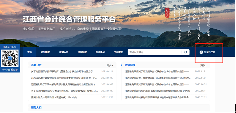 1. 按照全省政務(wù)服務(wù)一體化有關(guān)要求,從江西省會計綜合管理服務(wù)平臺點擊“登錄”或“注冊”先進(jìn)入江西政務(wù)服務(wù)網(wǎng)可信身份認(rèn)證系統(tǒng)界面,注冊或登錄后自動會把個人信息與會計綜合系統(tǒng)信息進(jìn)行綁定。