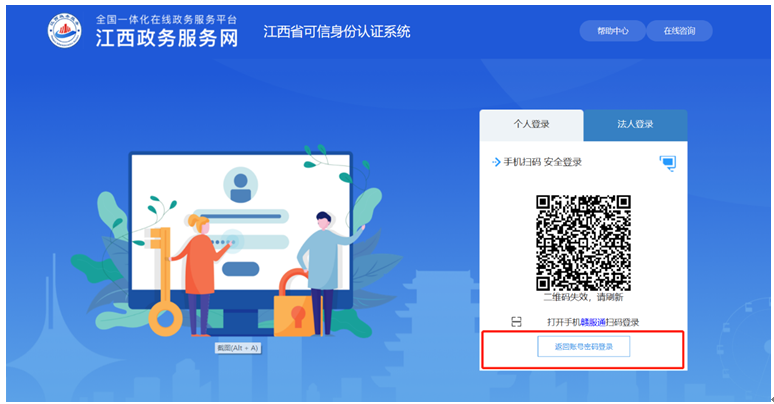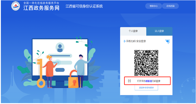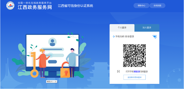 方式一:點擊“登錄”或“注冊”后進(jìn)入江西省可信身份認(rèn)證系統(tǒng)界面,桌面顯示登錄二維碼,用手機(jī)贛服通掃碼登錄