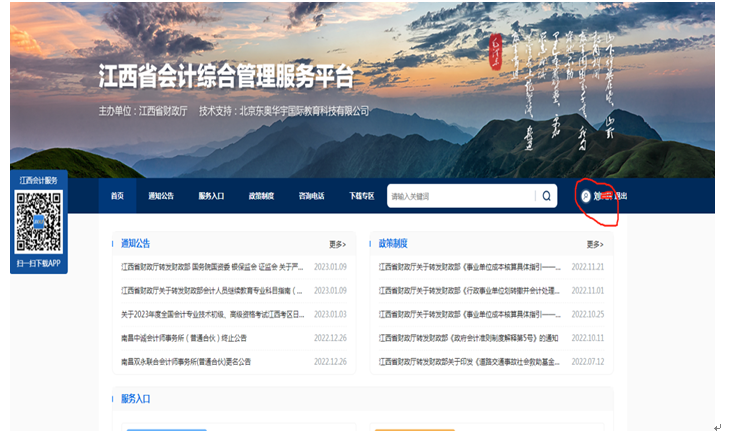 二、 系統(tǒng)登錄后,會進(jìn)入江西省會計綜合管理服務(wù)平臺界面,“登錄”處顯示為會計人員姓名“***”,表明登錄成功,可以在江西省會計綜合管理服務(wù)平臺進(jìn)行相關(guān)功能操作。