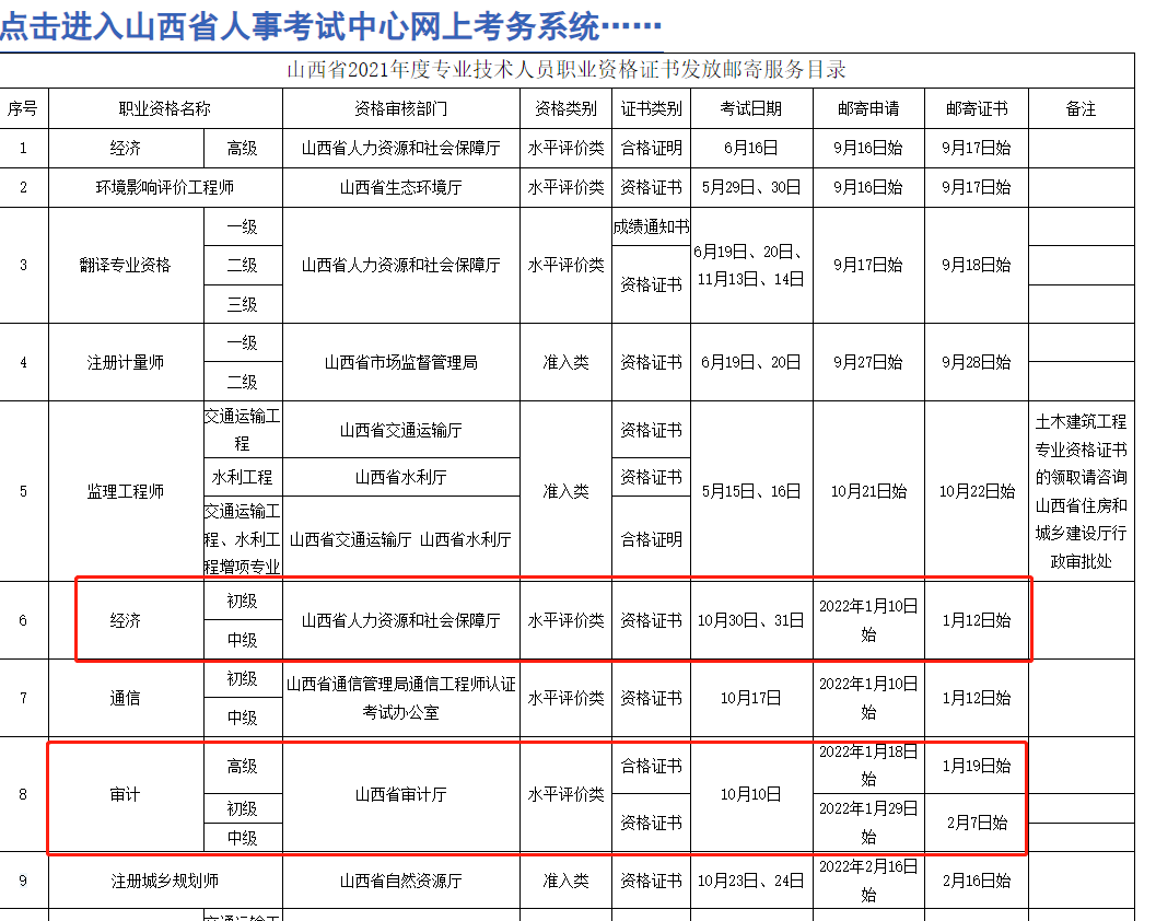 山西省人事考試中心發(fā)布《2021年度專業(yè)技術人員職業(yè)資格證書發(fā)放郵寄服務目錄》,目錄中發(fā)布了初級、中級、高級經濟師紙質證書發(fā)放的時間,具體時間如下圖: