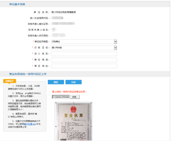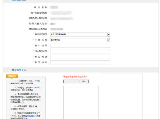進(jìn)入登錄頁單位財(cái)務(wù)人員登錄系統(tǒng),填報(bào)單位基本信息,上傳對(duì)應(yīng)的營(yíng)業(yè)執(zhí)照證件照片,照片保證清晰、完整,大小不超過10Mb;格式支持png、jpg