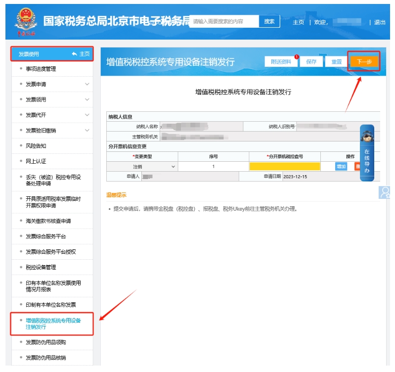 二、發(fā)票使用—增值稅稅控系統(tǒng)專用設(shè)備注銷發(fā)行,進入即可展現(xiàn)填寫界面,請根據(jù)頁面信息填寫完畢并上傳附送資料信息,點擊下一步提交。