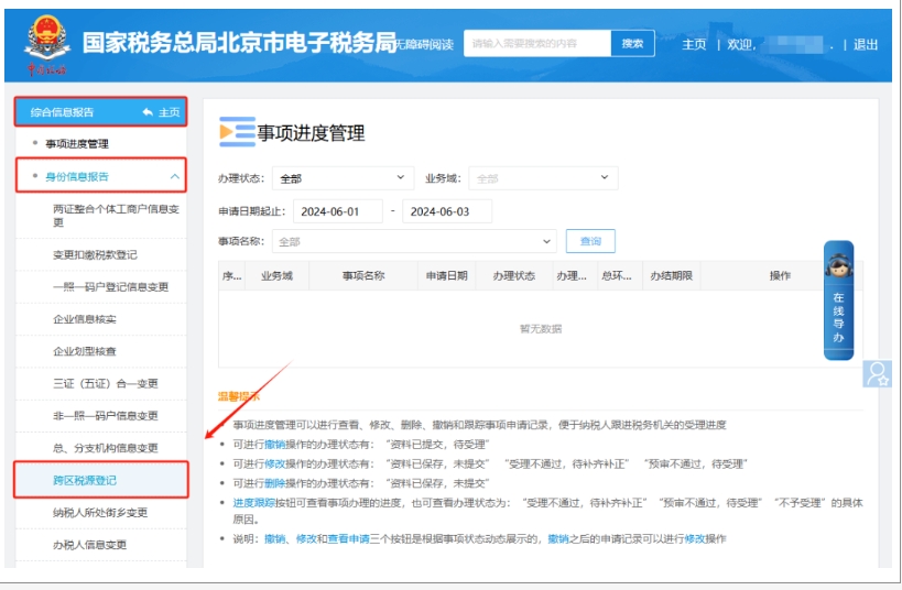 二、綜合信息報告—身份信息報告—跨區(qū)稅源登記,進入后點擊“02 查詢經(jīng)營項目地址及稅率”,在需要刪除的項目地址后方操作下方點擊【刪除】即可。