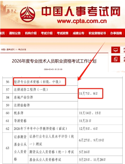 根據(jù)人力資源社會(huì)保障部辦公廳發(fā)布的《2026年度專業(yè)技術(shù)人員職業(yè)資格考試工作計(jì)劃》,中級(jí)經(jīng)濟(jì)師考試定于2026年11月7日、8日(周六、日)舉行?荚囋谌珖(guó)范圍內(nèi)采用電子化考試(機(jī)考)形式,共分4個(gè)批次,考生將以準(zhǔn)考證上標(biāo)注的具體批次和時(shí)間為準(zhǔn)。