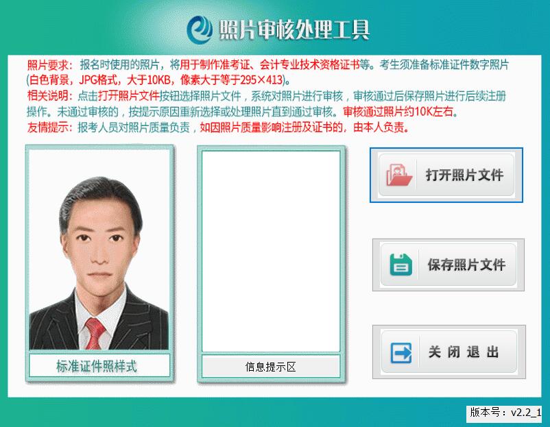 2、報名時使用的照片,將用于制作準考證、會計專業(yè)技術資格證書等?忌殰蕚錁藴首C件數(shù)字照片(白色背景,JPG格式,大于10KB,像素大于等于295×413),下載照片審核處理工具,按照規(guī)定要求,對報名照片格式