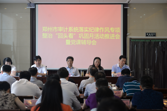 近日,河南省鄭州市審計(jì)局組織召開(kāi)全市審計(jì)機(jī)關(guān)紀(jì)律作風(fēng)專項(xiàng)整治“回頭看”鞏固月活動(dòng)推進(jìn)會(huì)。會(huì)上,參會(huì)全體黨員重溫了入黨誓詞,宣讀了《全市審計(jì)機(jī)關(guān)開(kāi)展紀(jì)律作風(fēng)專項(xiàng)整治“回頭看”鞏固月活動(dòng)督導(dǎo)方案》,黨組書(shū)記、局長(zhǎng)劉嘯峰同志對(duì)全市審計(jì)機(jī)關(guān)開(kāi)展紀(jì)律作風(fēng)專項(xiàng)整治“回頭看”鞏固月活動(dòng)進(jìn)行安排部署,并作“七一”黨課輔導(dǎo)報(bào)告。