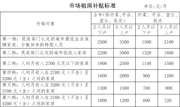 北京市住房和城鄉(xiāng)建設(shè)委員會(huì) 北京市財(cái)政局關(guān)于調(diào)整本市市場租房補(bǔ)貼申請(qǐng)條件及補(bǔ)貼標(biāo)準(zhǔn)的通知 京建法[2020]6號(hào) 2020-06-18 各區(qū)住房城鄉(xiāng)(市)建設(shè)委(房管局),各區(qū)財(cái)政局: 為進(jìn)一步完善住房保障制度,加快解決城鎮(zhèn)中低收入家庭住房困難,根據(jù)《關(guān)于進(jìn)一步規(guī)范發(fā)展公租房的意見》(建!2019〕55號(hào)),經(jīng)市委市政府批準(zhǔn),現(xiàn)就調(diào)整本市市場租房補(bǔ)貼申請(qǐng)條件及補(bǔ)貼標(biāo)準(zhǔn)有關(guān)問題通知如下: 一、調(diào)整市場租房補(bǔ)貼申請(qǐng)條件 本市城鎮(zhèn)戶籍家庭同時(shí)具備以下條件的,可以以家庭為單位申請(qǐng)市場租房補(bǔ)貼: (一)申請(qǐng)當(dāng)月前12個(gè)月家庭人均月收入不高于4200元; (二)申請(qǐng)家庭成員在本市均無住房且在本市生活; (三)3人及以下家庭總資產(chǎn)凈值57萬元及以下,4人及以上家庭總資產(chǎn)凈值76萬元及以下。 二、調(diào)整市場租房補(bǔ)貼標(biāo)準(zhǔn) (一)市場租房補(bǔ)貼標(biāo)準(zhǔn)考慮本市經(jīng)濟(jì)社會(huì)發(fā)展水平、財(cái)政承受能力、房屋市場租金水平等因素,根據(jù)保障家庭人口結(jié)構(gòu)、收入水平分檔確定。具體見下表: