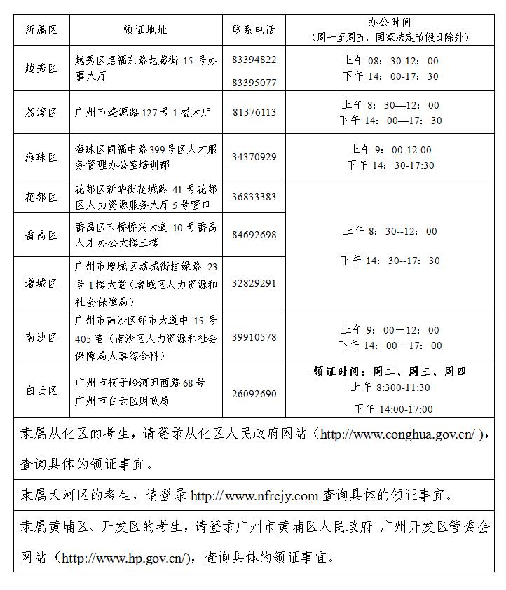 廣州市2017年度全國會計專業(yè)技術初級資格證書已發(fā)至各區(qū)相關負責部門,請考生持身份證原件(代領的,需出示代領者和考生的身份證原件)按報名時隸屬的區(qū)查詢、領取資格證書,具體領證地址及聯(lián)系方式如下: