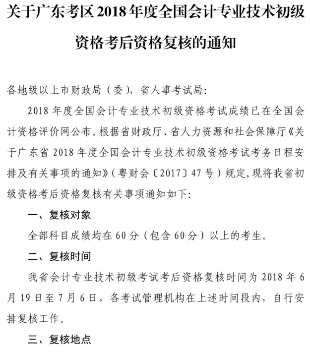 關(guān)于廣東考區(qū)2018年度全國(guó)會(huì)計(jì)專(zhuān)業(yè)技術(shù)初級(jí)資格考后資格復(fù)核的通知