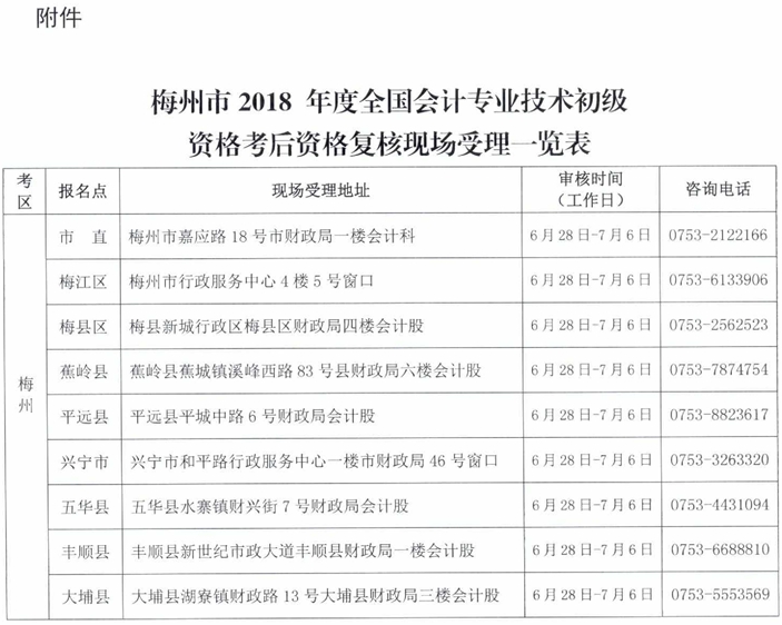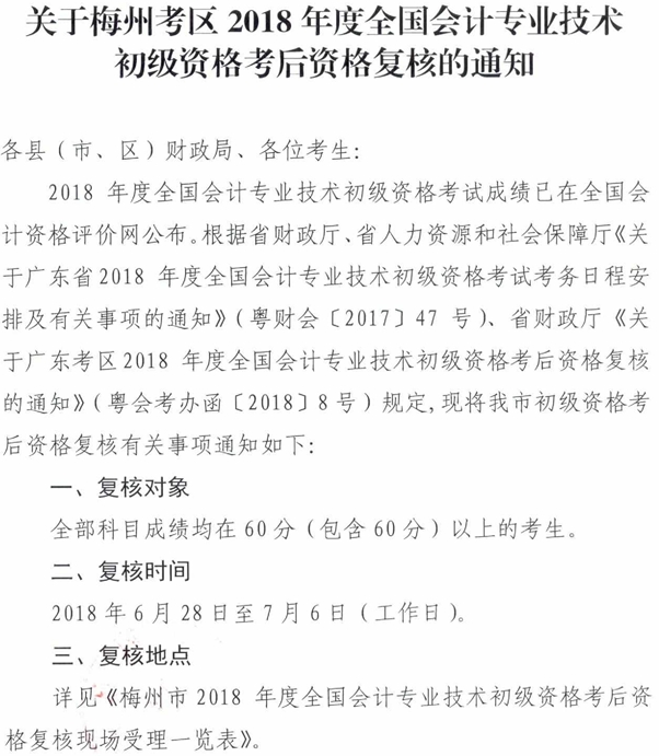 關(guān)于梅州考區(qū)2018年度全國會計(jì)專業(yè)技術(shù) 初級資格考后資格復(fù)核的通知