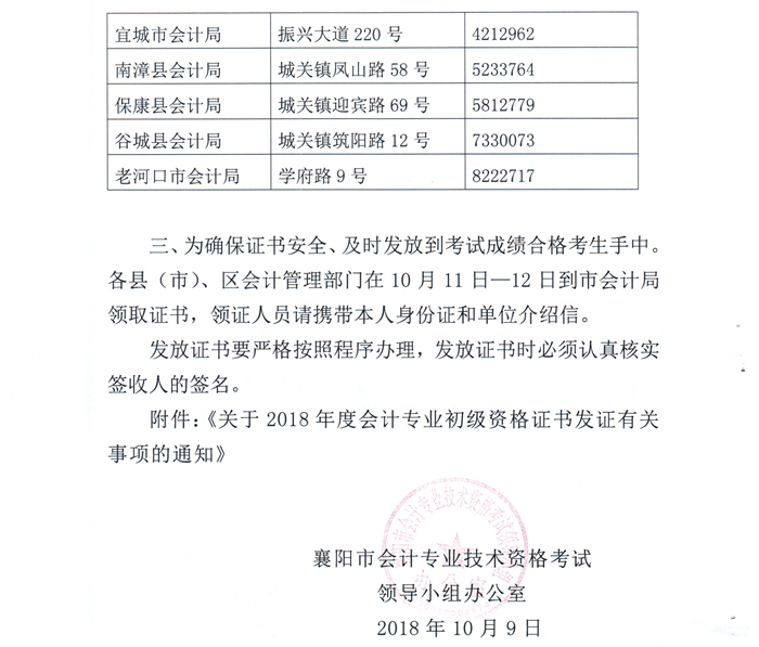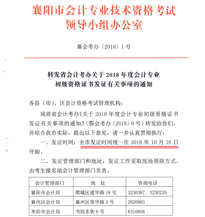湖北省襄陽市2018年初級(jí)會(huì)計(jì)資格證書從2018年10月16日開始發(fā)放,請(qǐng)領(lǐng)取初級(jí)會(huì)計(jì)證書的人員攜帶本人身份證到指定地點(diǎn)領(lǐng)取證書。