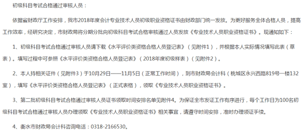 河北省衡水市2018年第二批初級(jí)會(huì)計(jì)資格證書領(lǐng)取時(shí)間:2018年10月29日-2018年11月5日,請大家攜帶近期一寸白底證件照1張、本人身份證原件、初級(jí)會(huì)計(jì)2018年考試成績通知單、水平評價(jià)類資格考試合格人員登記表(草表)到指定地點(diǎn)領(lǐng)取初級(jí)會(huì)計(jì)證書。