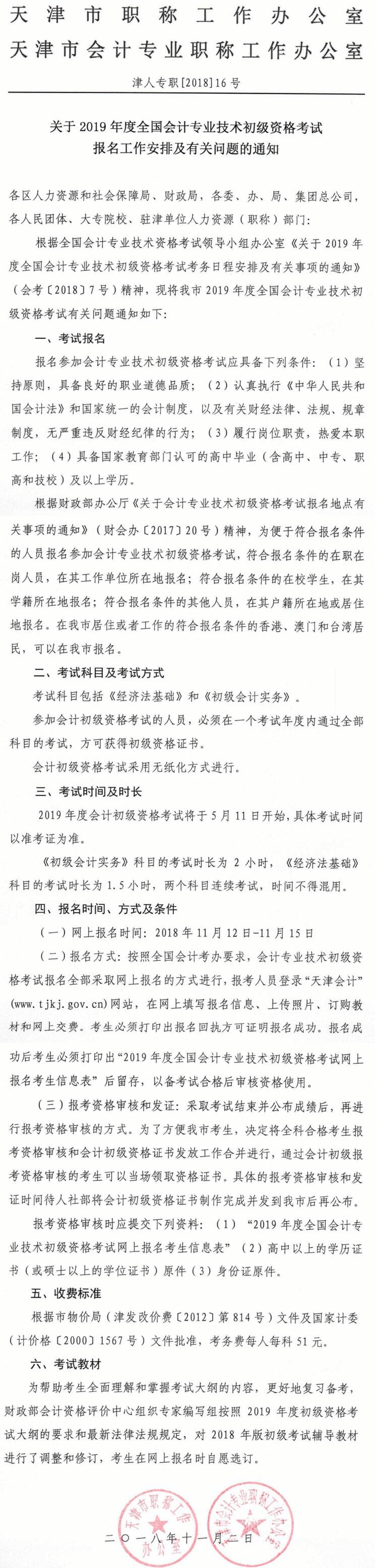 天津市2019年初級會計職稱考試報名時間為2018年11月12日-2018年11月15日,采取考后資格審核的方式,請參加2019年會計初級考試的考生按照簡章要求,在規(guī)定時間內(nèi)完成初級會計考試報名和繳費(fèi)。