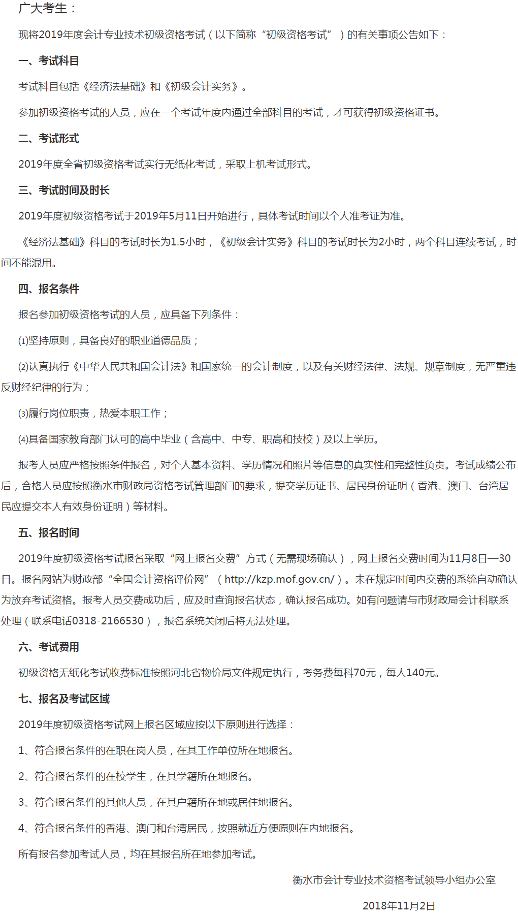 衡水市關(guān)于2019年度全國(guó)會(huì)計(jì)專業(yè)技術(shù)初級(jí)資格考試有關(guān)事項(xiàng)的公告