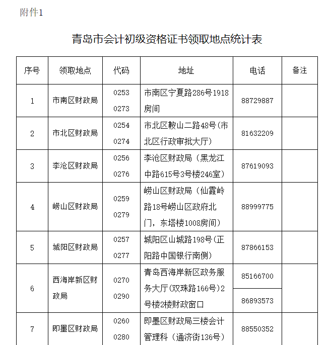 1.青島市會計初級資格證書領取地點統(tǒng)計表