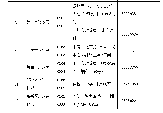 2.證書管理號:考試合格人員若忘記考試報名選擇的區(qū)(市)財政局,請根據(jù)證書管理號查詢領取地點。證書管理號第12至15位,為領取地區(qū)(市)財政局代碼。如XXXXXXXXXXX0253XXXXX和XXXXXXXXXXX0273XXXXX(外市調入青島市考試成績合格人員),領取地點為市南區(qū)財政局;其他區(qū)(市)財政局代碼及領取地點、聯(lián)系電話詳見附件1。