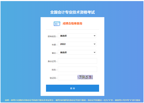 第四步:按要求分別輸入“報(bào)考級(jí)別”、“年度”、“省份”、“身份證號(hào)”、“姓名”和“驗(yàn)證碼”后,點(diǎn)擊“查詢(xún)”。