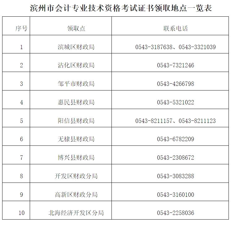附:2023年度濱州市會計專業(yè)技術(shù)初級資格證書領(lǐng)取地點一覽表