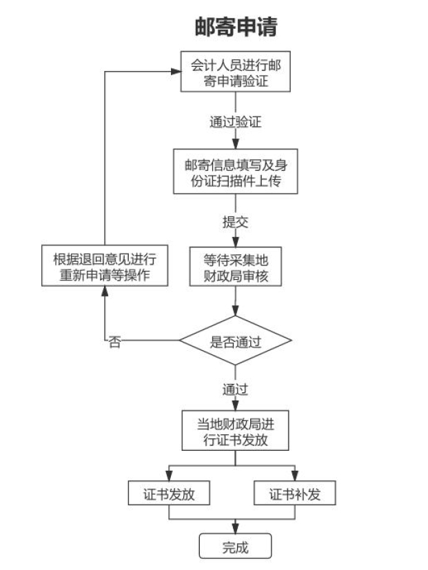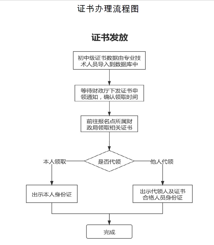 (一)證書發(fā)放。成績合格人員,持本人身份證原件到報名時所選財政局現(xiàn)場領(lǐng)。ㄓ伤舜I(lǐng)的,需出示代領(lǐng)人和證書合格人員身份證原件),也可登陸“會計人員信息采集系統(tǒng)-證書郵寄申請模塊”申請郵寄服務(wù),郵寄費用由申領(lǐng)人承擔(dān)。具體流程見《證書辦理流程圖》。