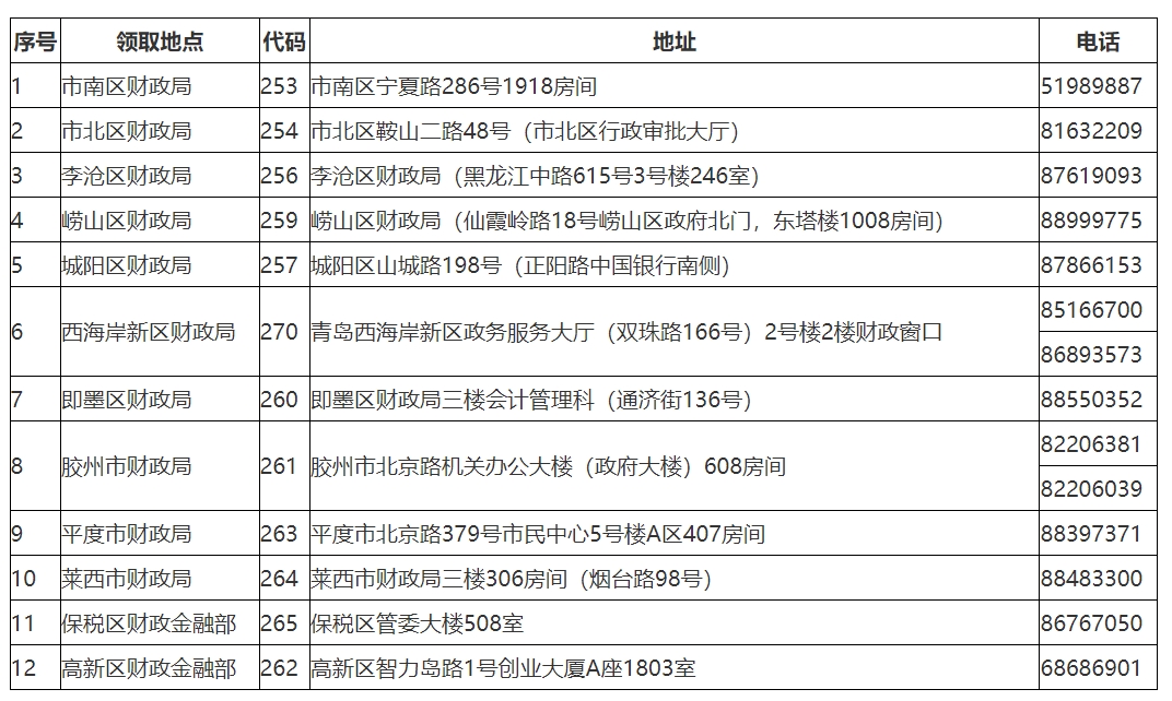 2.證書管理號:考試合格人員若忘記考試報名選擇的區(qū)(市)財政局,請根據(jù)證書管理號查詢領(lǐng)取地點。證書管理號第12至15位,為領(lǐng)取地區(qū)(市)財政局代碼。如317XXXXXXXX0253XXXXX,領(lǐng)取地點為市南區(qū)財政局;其他區(qū)(市)財政局代碼及領(lǐng)取地點、聯(lián)系電話詳見附件1。