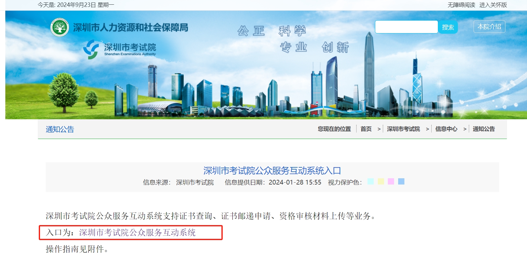 深圳市考試院公眾服務(wù)互動(dòng)系統(tǒng)支持證書查詢、證書郵遞申請(qǐng)、資格審核材料上傳等業(yè)務(wù)。