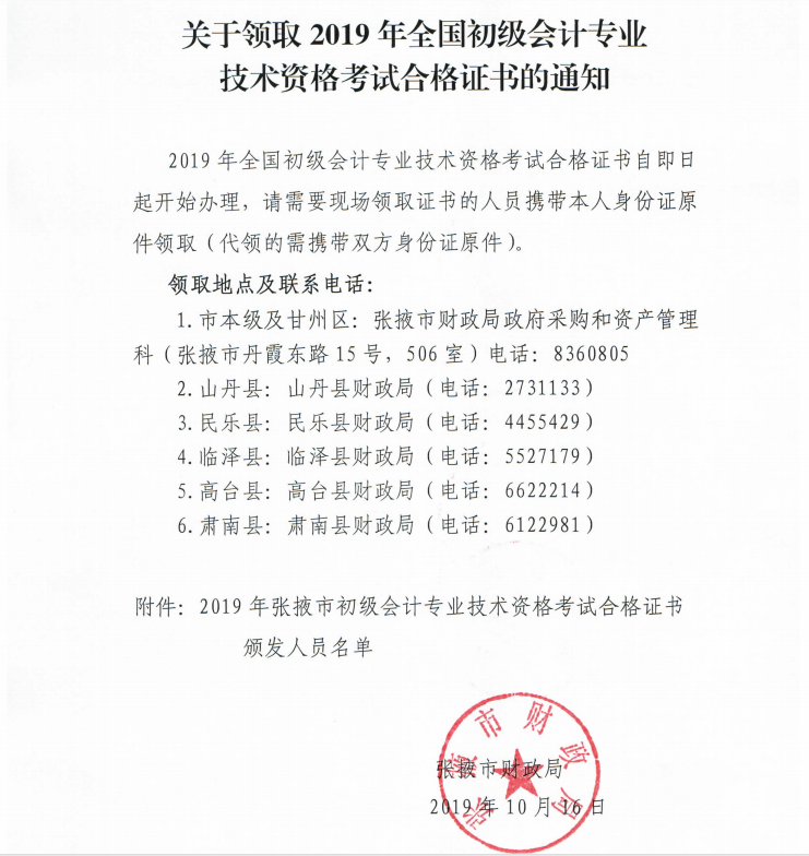 2019年甘肅張掖初級(jí)會(huì)計(jì)證書領(lǐng)取的通知!