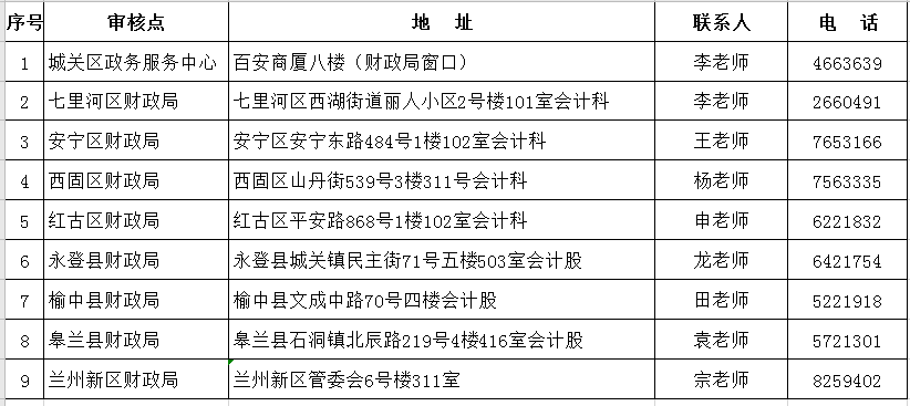 3.蘭州市設(shè)立了9個報名審核確認點(地址和聯(lián)系電話見附件)。蘭州市財政局主要負責(zé)全市報名組織協(xié)調(diào)、政策解答、報名信息匯總和網(wǎng)上繳費對賬,請報考人員在公告的報名現(xiàn)場審核點報名審核。
