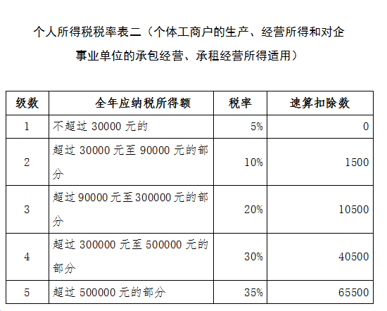 2.個(gè)人所得稅稅率表二[個(gè)體工商戶的生產(chǎn)、經(jīng)營(yíng)所得和對(duì)企事業(yè)單位的承包經(jīng)營(yíng)、承租經(jīng)營(yíng)所得適用]
