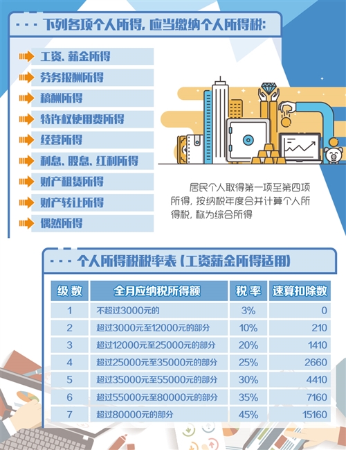新個(gè)稅法結(jié)合當(dāng)前征管能力和配套條件等實(shí)際情況,將工資、薪金所得,勞務(wù)報(bào)酬所得,稿酬所得,特許權(quán)使用費(fèi)所得等4項(xiàng)勞動(dòng)性所得(稱為“綜合所得”)納入綜合征稅范圍,適用統(tǒng)一的超額累進(jìn)稅率,居民個(gè)人按年合并計(jì)算個(gè)人所得稅。
