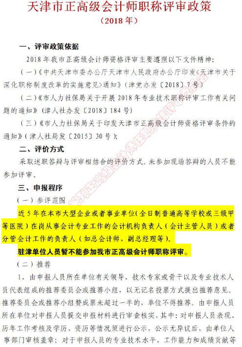 天津2018年正高級(jí)會(huì)計(jì)師職稱評(píng)審政策如下,采取述職答辯與評(píng)審相結(jié)合的評(píng)價(jià)方式,未參加現(xiàn)場(chǎng)答辯的人員不能參加評(píng)審。