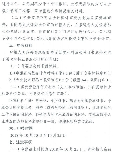 二、注意事項(xiàng):申報(bào)截止時(shí)間為2018年10月25日,請(qǐng)申報(bào)人在截止時(shí)間前將評(píng)審材料報(bào)送到云南省財(cái)政廳會(huì)計(jì)處,逾期不予受理。