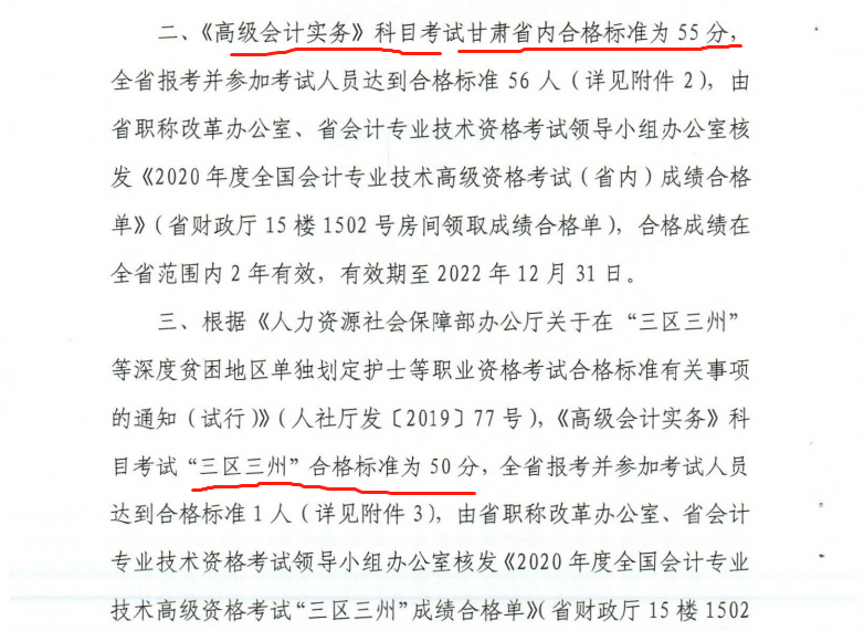 甘肅省發(fā)布《關(guān)于2020年度全國會(huì)計(jì)專業(yè)技術(shù)高級(jí)資格考試合格標(biāo)準(zhǔn)等有關(guān)問題的通知》的通知,甘肅2020年度高級(jí)會(huì)計(jì)師資格考試《高級(jí)會(huì)計(jì)實(shí)務(wù)》科目考試,甘肅省內(nèi)合格標(biāo)準(zhǔn)為55分。以下為通知全文: