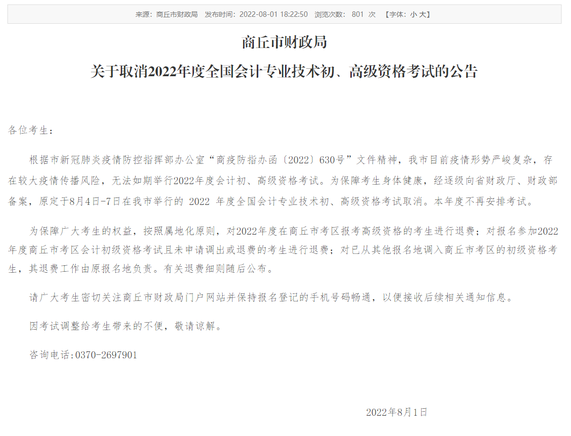 根據(jù)市新冠肺炎疫情防控指揮部辦公室“商疫防指辦函〔2022〕630號”文件精神,我市目前疫情形勢嚴峻復(fù)雜,存在較大疫情傳播風險,無法如期舉行2022年度會計初、高級資格考試。為保障考生身體健康,經(jīng)逐級向省財政廳、財政部備案,原定于8月4日-7日在我市舉行的 2022 年度全國會計專業(yè)技術(shù)初、高級資格考試取消。本年度不再安排考試。
