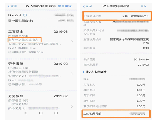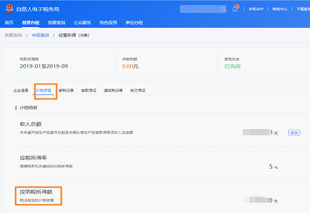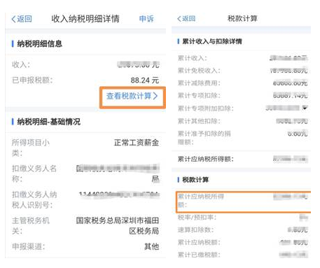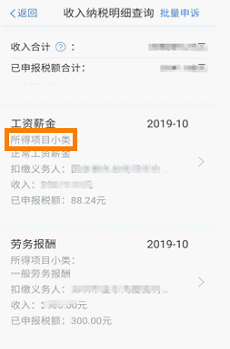 、诿恳还P申報都會顯示【所得項目小類】,“正常工資薪金”按任職單位選擇2019年度內最后一個屬期的申報記錄,進入申報明細頁面后點擊【查看稅款計算】即顯示該任職單位的“累計應納稅所得額”。多家任職單位需分別將最后一筆“正常工資薪金”申報記錄的“累計應納稅所得額”相加。