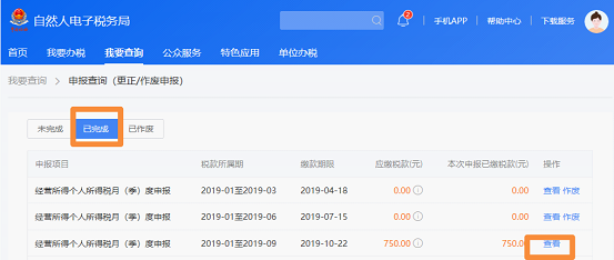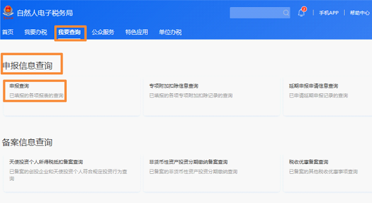2.工資、薪金所得--非居民納稅人 非居民納稅人取得【所得項目小類】為“無住所個人正常工資薪金”需按月查看應納稅所得額并累加,非居民納稅人如還取得【所得項目小類】為“無住所個人數月獎金”和“個人股權激勵收入”的工資薪金,需分別查詢對應的應納稅所得額,與“無住所個人正常工資薪金”應納稅所得額相加,計算工資薪金所得項目全年應納稅所得額。“個人股權激勵收入”如有多筆,需按扣繳單位查詢最后一筆申報的“累計應納稅所得額”。 3.勞務報酬、稿酬、特許權使用費所得 查詢路徑同工資、薪金所得,進入申報明細頁面后直接顯示“應納稅所得額”。如有多筆申報記錄,需逐筆相加計算全年應納稅所得額。 4.經營所得 、俚卿涀匀蝗穗娮佣悇站諻EB端,點擊【我要查詢】-【申報信息查詢】-【申報查詢】