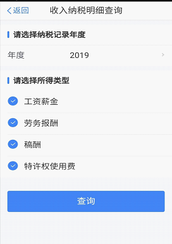 注:實際繳納稅款金額在查詢應納稅所得額時也可查看,此處一張清單上顯示全部所得項目的全年的數據,可避免遺漏。 第二步:查詢符合補貼申報條件的稅額對應的應納稅所得額 因項目不同查詢路徑有所不同,下面分別介紹。 1.工資、薪金所得--居民納稅人 、俚卿泜人所得稅APP,點擊【我要查詢】-【收入納稅明細查詢】,選擇納稅年度為2019,點擊【查詢】按鈕。