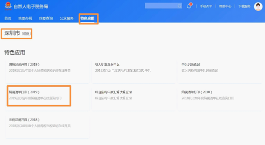 2.點擊【特色應用】,切換為(再次登錄將默認為深圳市),進入【納稅清單打印(2019)】