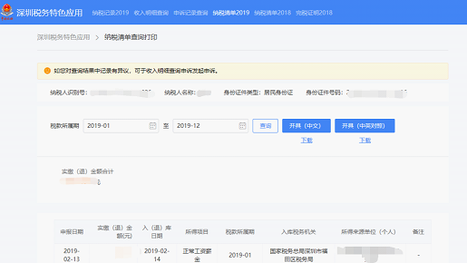 稅款所屬期選擇2019-01至2019-12,點擊【查詢】即顯示2019年度個人在全國范圍內的申報納稅記錄。本頁面支持中英版納稅清單開具。 申報人可根據所得項目和所得來源單位信息篩選出符合我市補貼申報條件的記錄,并計算實際繳納稅額。