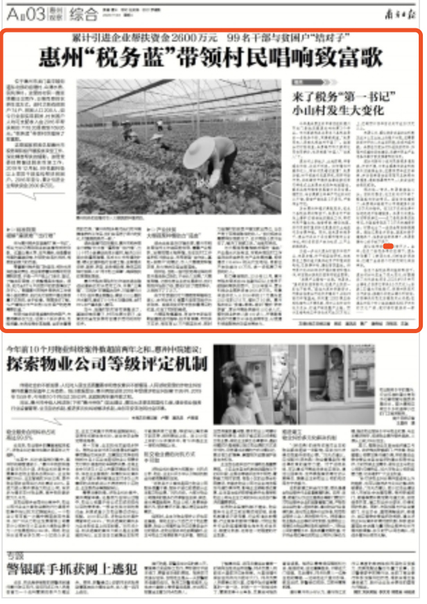 助力精準(zhǔn)脫貧,2019年12月,惠州市稅務(wù)局派出99名副科級(jí)以上黨員干部掛鉤幫扶貧困戶。2016年至今,累計(jì)引進(jìn)企業(yè)幫扶資金2600多萬(wàn)元。村集體經(jīng)濟(jì)收入從2016年的2.7萬(wàn)提升至2020年的27.8萬(wàn),增長(zhǎng)了9.3倍;葜荻悇(wù)還以“黨建+教育+培訓(xùn)”模式“扶志扶智”,累計(jì)開展各類培訓(xùn)1100多人次,幫助就業(yè)扶貧人數(shù)100多人,開展教育扶貧行動(dòng)惠及90余名貧困學(xué)生,以黨建引領(lǐng)凝聚脫貧攻堅(jiān)發(fā)展合力。