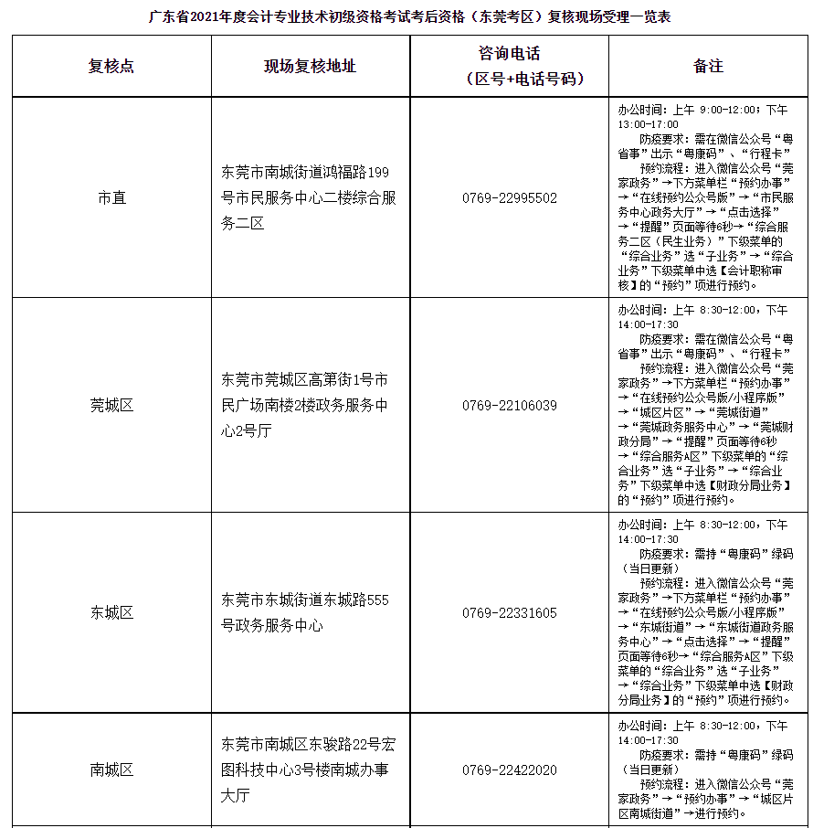 《2021年度全國(guó)會(huì)計(jì)專業(yè)技術(shù)初級(jí)資格考試網(wǎng)上報(bào)名考生信息表》中“報(bào)名點(diǎn)名稱”欄所在地財(cái)政分局,詳見(jiàn)《廣東省2021年度會(huì)計(jì)專業(yè)技術(shù)初級(jí)資格考試考后資格(東莞考區(qū))復(fù)核現(xiàn)場(chǎng) 受理一覽表》(附件)。